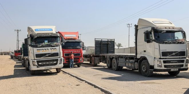 وسمحت الحكومة الإسرا-ئيلية، الثلاثاء، بتفتيش شاحنات المساعدات في معبر كرم أبو سالم للمرة الأولى منذ هجوم حركة “ح-م-اس” في 7 أكتوبر/تشرين الأول، ولكن لا يزال يتعين على هذه الشاحنات العودة عبر مصر قبل دخول غ-زة عبر معبر رفح.