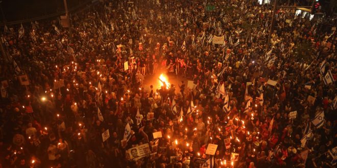 خرج آلاف المتظاهرين إلى شوارع تل أبيب والقدس وقيسارية ورعنانا وهرتسليا، السبت، مطالبين بالإفراج عن جميع الرهائن المحتجزين في غ-زة وإقالة رئيس الوزراء الإسرائيلي بنيامين نتنياهو من منصبه.