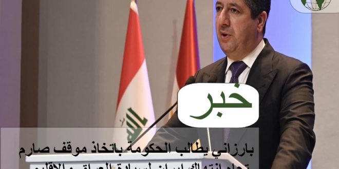 طالب رئيس حكومة اقليم كردستان، مسرور بارزاني، الحكومة العراقية باتخاذ موقف صارم تجاه انتهاك ايران لسيادة العراق والاقليم، بعد تعرض اربيل لقصف صاروخي من قبل الحرس الثوري الايراني.