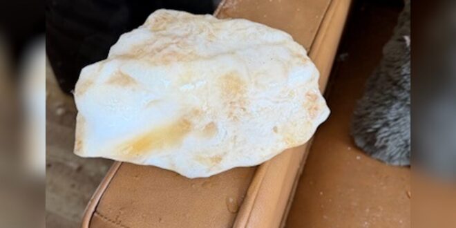 قال شخص من ولاية كاليفورنيا الأمريكية ويُدعى يودر غراو إنه كان قد نهض لتوه من أريكته عندما اخترقت كتلة جليدية متسخة سقف منزله، وسقطت في المكان الذي كان يجلس فيه.