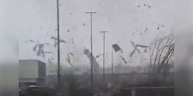 التقط سائق سيارة مشاهد لإعصار في مدينة “ثري ريفرز”، بولاية ميشيغان الأمريكية، وهو يمزق المباني ويقتلع سقف مستودع.