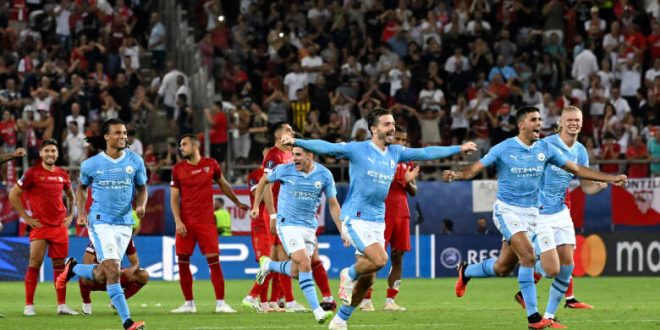 حصد نادي مانشستر سيتي الإنجليزي لقب كأس السوبر الأوروبي 2023، بعد تفوّقه على نظيره إشبيلية الإسباني في المباراة النهائية، بركلات الترجيح بنتيجة 4/5، عقب نهاية الوقت الأصلي بالتعادل الإيجابي بهدف لمثله.