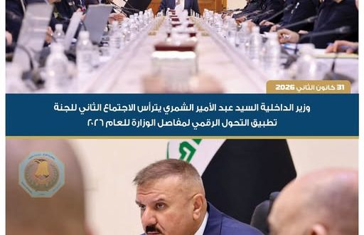 وزير الداخلية السيد عبد الأمير الشمري يترأس الاجتماع الثاني للجنة تطبيق التحول الرقمي لمفاصل الوزارة للعام 2026 فبراير 1, 2026 عربي و دولى اضف تعليق 57 زيارة مقالات مشابهة شهد النهائي "أحد أسرع الأهداف".. سوسيداد يفوز بكأس إسبانيا على حساب أتلتيكو 6 ساعات مضت شهد النهائي "أحد أسرع الأهداف".. سوسيداد يفوز بكأس إسبانيا على حساب أتلتيكو 6 ساعات مضت "شرق السودان يطلب الانفصال".. ما حقيقة الفيديو المتداول 6 ساعات مضت شاركها Facebook Twitter Stumbleupon LinkedIn Pinterest